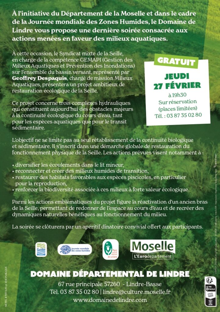 Dans le cadre du mois des Zones Humides, plusieurs conférences thématiques ont été programmées pour vous faire découvrir et comprendre les écosystèmes en lien avec l’eau. La prochaine et dernière se tiendra le 27 février (un vendredi et non un jeudi !) et portera sur le thème de la restauration de la Seille.